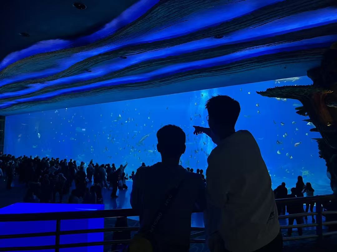 我们走进那个巨大的蓝色世界,成千上万的鱼群在头顶游弋,光线透过水波,投射下摇曳的光影。大家瞬间都安静了下来,仿佛闯进了一个静谧而神圣的梦境。在海牛馆、企鹅馆,我们像孩子一样,把脸贴在玻璃上,看这些可爱的生物憨态可掬地游动。